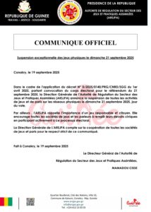 COMMUNIQUÉ DE L'AUTORITÉ DE RÉGULATION DU SECTEUR DES JEUX ET PRATIQUES ASSIMILÉES ( ARSJPA). <img class="size-medium wp-image-31038 alignright" src="https://guineeenmarche.com/wp-content/uploads/2025/09/Screenshot_20250919_230005_Word-214x300.jpg" alt="" width="214" height="300" />