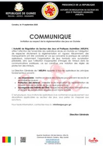 <img class="size-medium wp-image-31032 alignright" src="https://guineeenmarche.com/wp-content/uploads/2025/09/images-300x264.jpeg" alt="" width="300" height="264" /> COMMUNIQUÉ DE L'AUTORITÉ DE RÉGULATION DU SECTEUR DES JEUX ET PRATIQUES ASSIMILÉES (ARSJPA)<a href="https://guineeenmarche.com/wp-content/uploads/2025/09/COMMUNIQUE_JEU_RESPONSABLE.pdf">COMMUNIQUÉ_JEU_RESPONSABLE</a> <img class="size-medium wp-image-31062 alignright" src="https://guineeenmarche.com/wp-content/uploads/2025/09/Screenshot_20250929_165732_Word-211x300.jpg" alt="" width="211" height="300" />